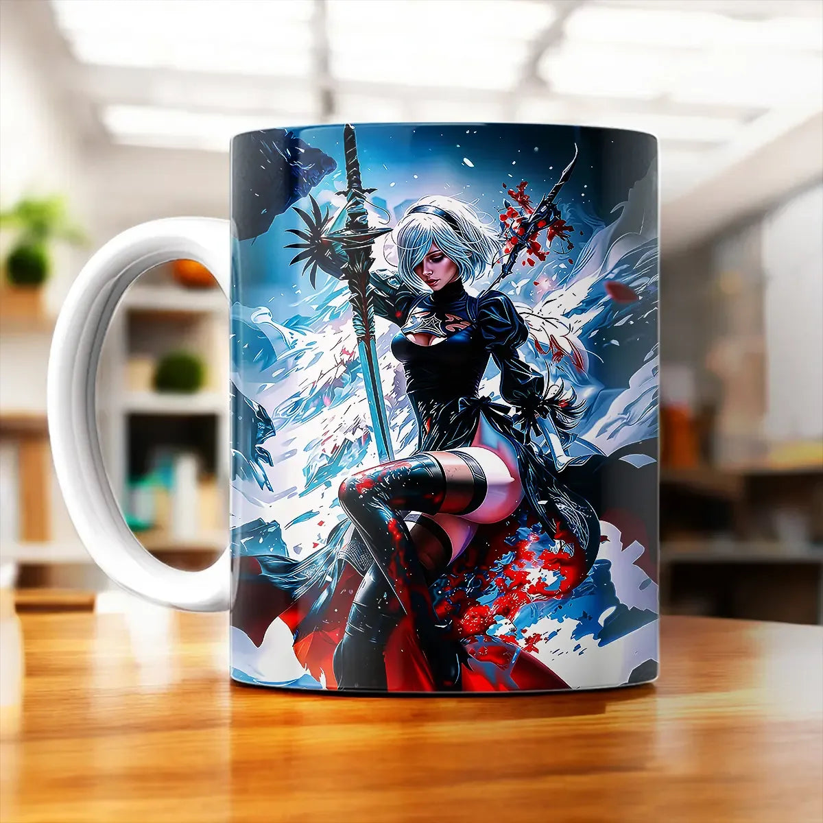 Ce mug illustré fait main est une idée cadeau parfaite pour un fan de jeux vidéo, un collectionneur ou pour soi-même, parce qu’on a le droit. Sublimé par la chaleur sur les deux faces, il révèle pleinement le visuel et le design inspiré de l’univers de Nier Automata. Offrez-le pour un anniversaire, une réussite ou juste parce que “on pensait à toi”: effet garanti.