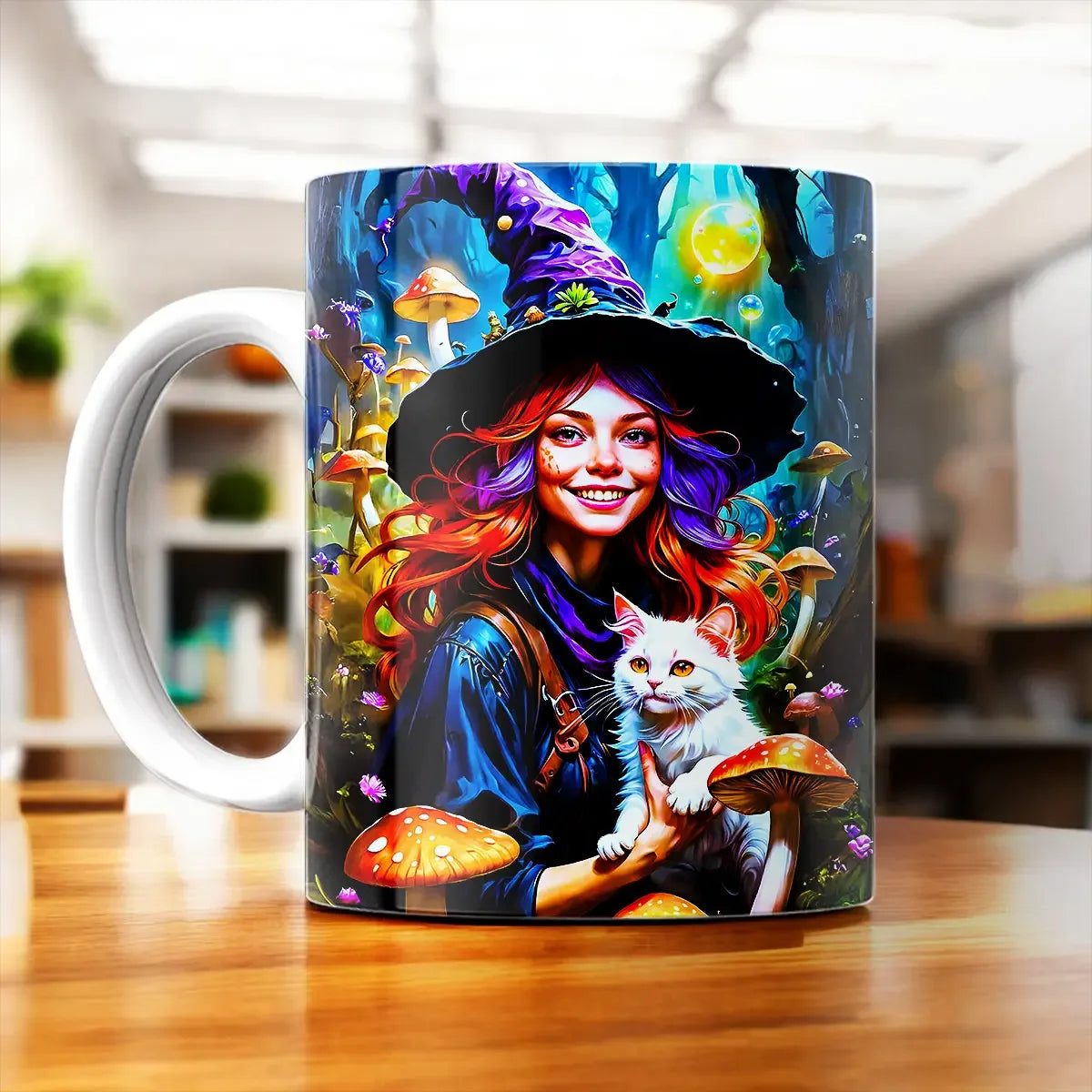 Cette tasse Sorcière Chat Champignon n'est pas seulement jolie, elle est pensée pour la vie de tous les jours. Contenance idéale de 325 ml, anse confortable, design imprimé sur les deux faces par sublimation thermique — bref, pratique et charmante. Passe au micro-ondes et au lave-vaisselle, donc votre pause café ou thé reste simple et sans prise de tête, même quand la magie du matin traîne un peu.