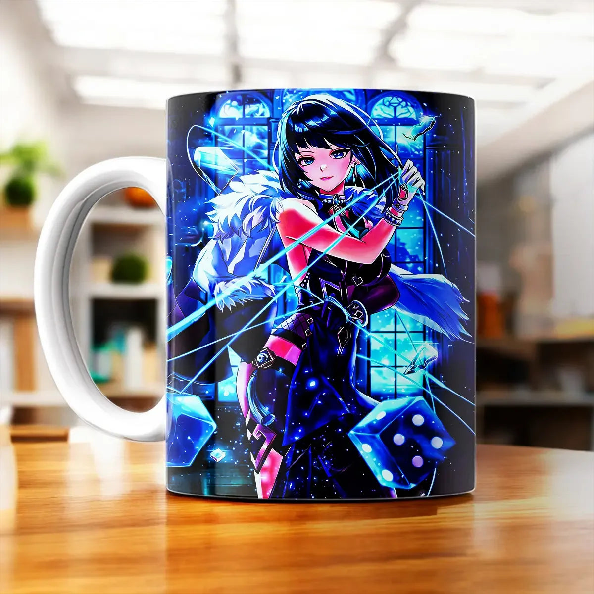 Cette tasse Yelan mixe design soigné et praticité. L'illustration dessinée à la main sur tablette graphique capte les nuances Hydro et l'ambiance nocturne de Liyue sans tomber dans l'outrance. Elle devient vite le mug qu'on sort quand on veut impressionner sans en faire trop, celui qu'on ne prête pas forcément parce qu'on l'aime trop.
