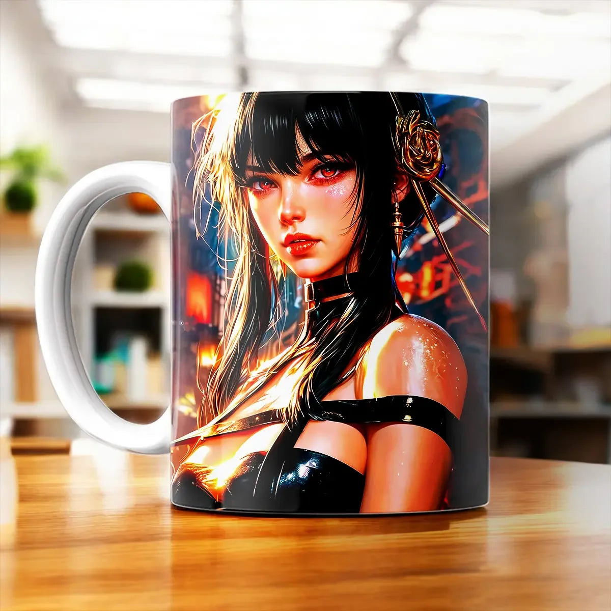 La tasse Yor Forger marie design et quotidien. Le visuel, dessiné à la main sur tablette graphique, capture la dualité tendre et badass du personnage. C'est le genre d'objet qu'on ne prête pas toujours, celui qui devient vite votre allié du matin, prêt à vous suivre au bureau, en télétravail ou sur votre canapé préféré.