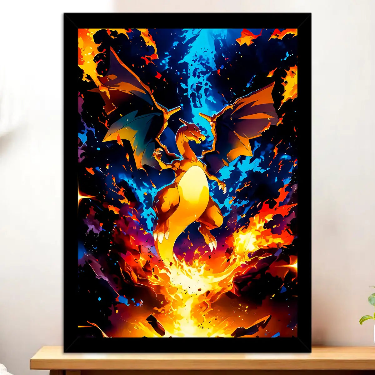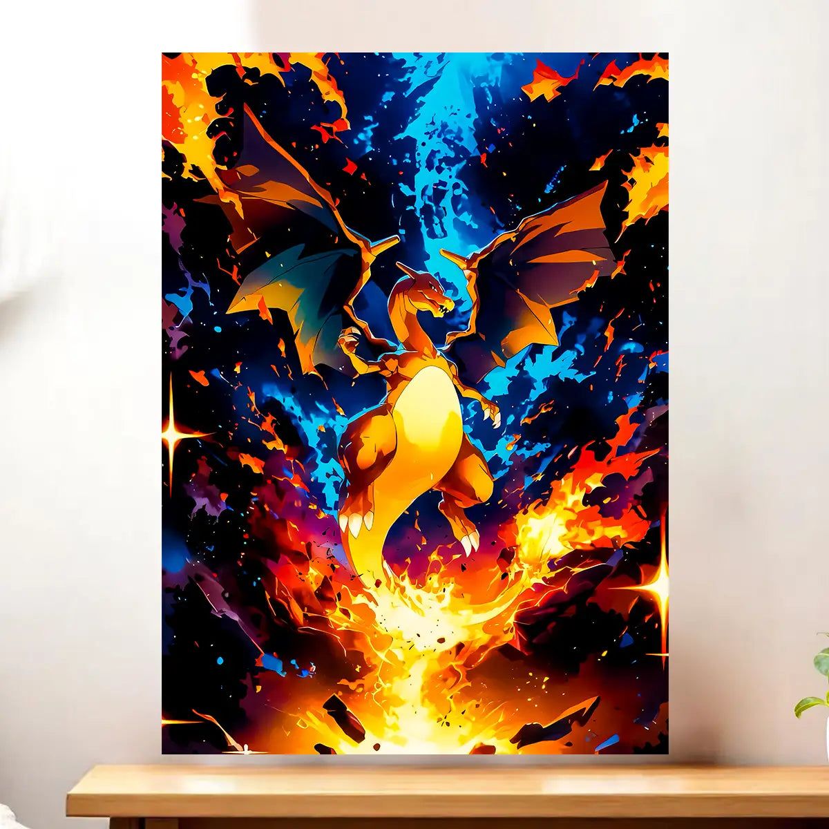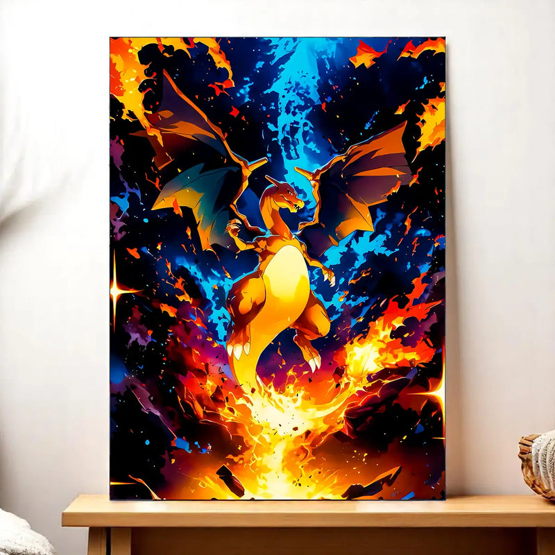 Ce tableau Dracaufeu est imprimé sur une toile tendue sur châssis FSC (format 21×29 cm). La texture de la toile amplifie l'intensité dramatique des flammes et donne une profondeur impressionnante à l'explosion d'énergie qui entoure Dracaufeu. On ressent presque la chaleur des flammes et la force du souffle brûlant. Une pièce qui transforme n'importe quel mur en arène Pokémon, rappelant ces combats épiques où Dracaufeu dominait avec Lance-Flammes et Danse Draco.