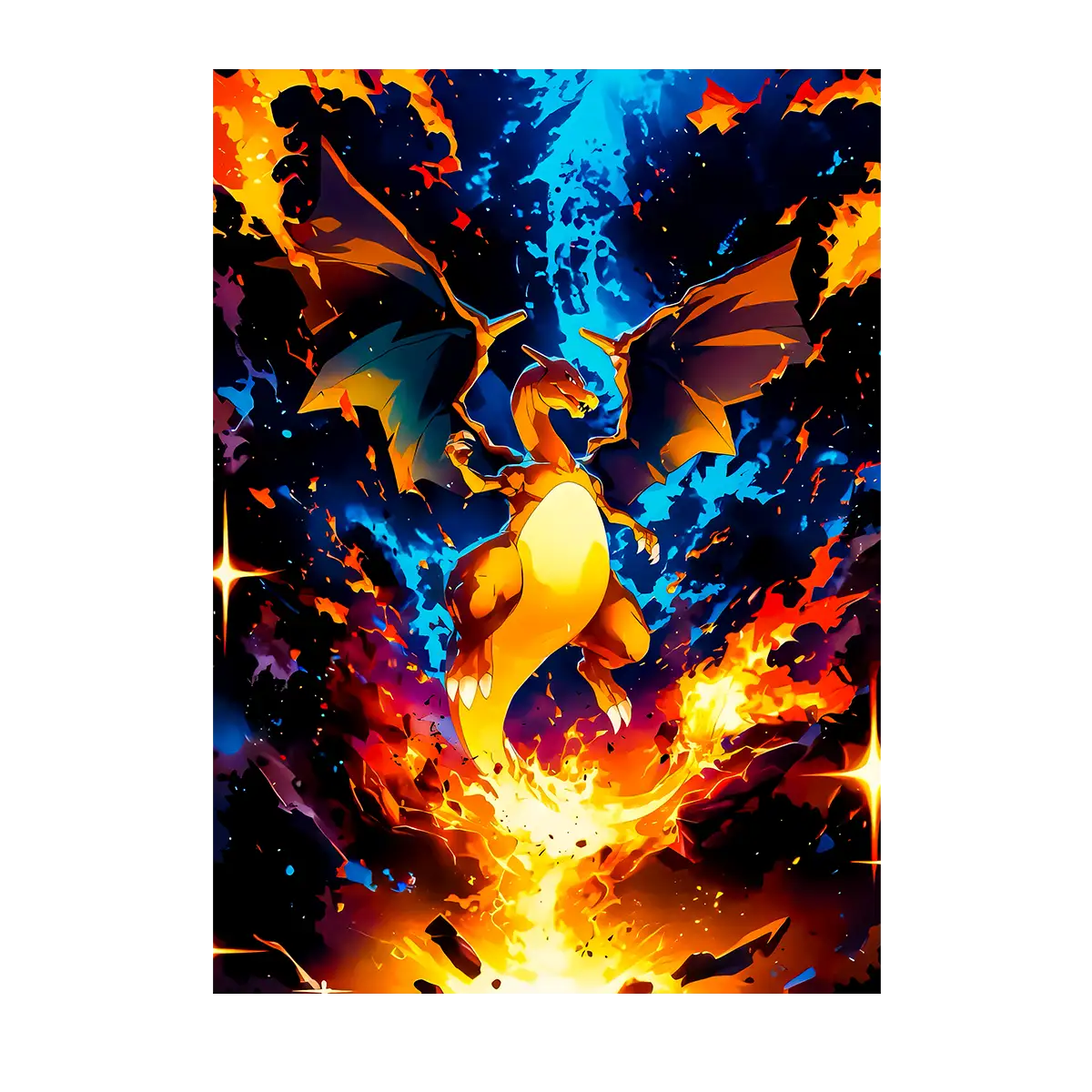 Des flammes explosives qui déchirent la nuit, un rugissement qui fait trembler le ciel et ces ailes puissantes déployées dans une explosion de couleurs… voilà le Poster Dracaufeu. Le starter ultime de la première génération, celui que tout dresseur rêvait d'avoir dans son équipe, capturé dans toute sa gloire. Ce visuel épique immortalise l'instant où Dracaufeu déchaîne sa puissance de type Feu et Vol, entouré de flammes bleues et orangées qui illuminent l'obscurité. Illustration dessinée à la main sur tablette graphique, chaque flamme, chaque écaille et chaque éclat de lumière a été retravaillé pour sublimer la majesté de ce dragon légendaire. Un hommage au Pokémon qui a marqué des générations de dresseurs depuis Pokémon Rouge et Bleu.