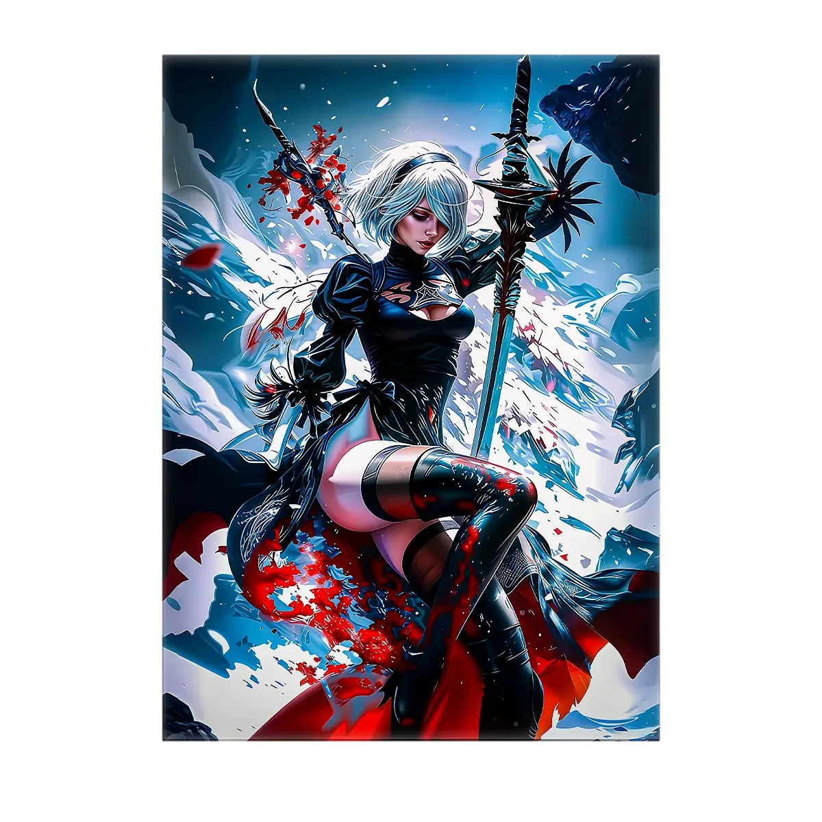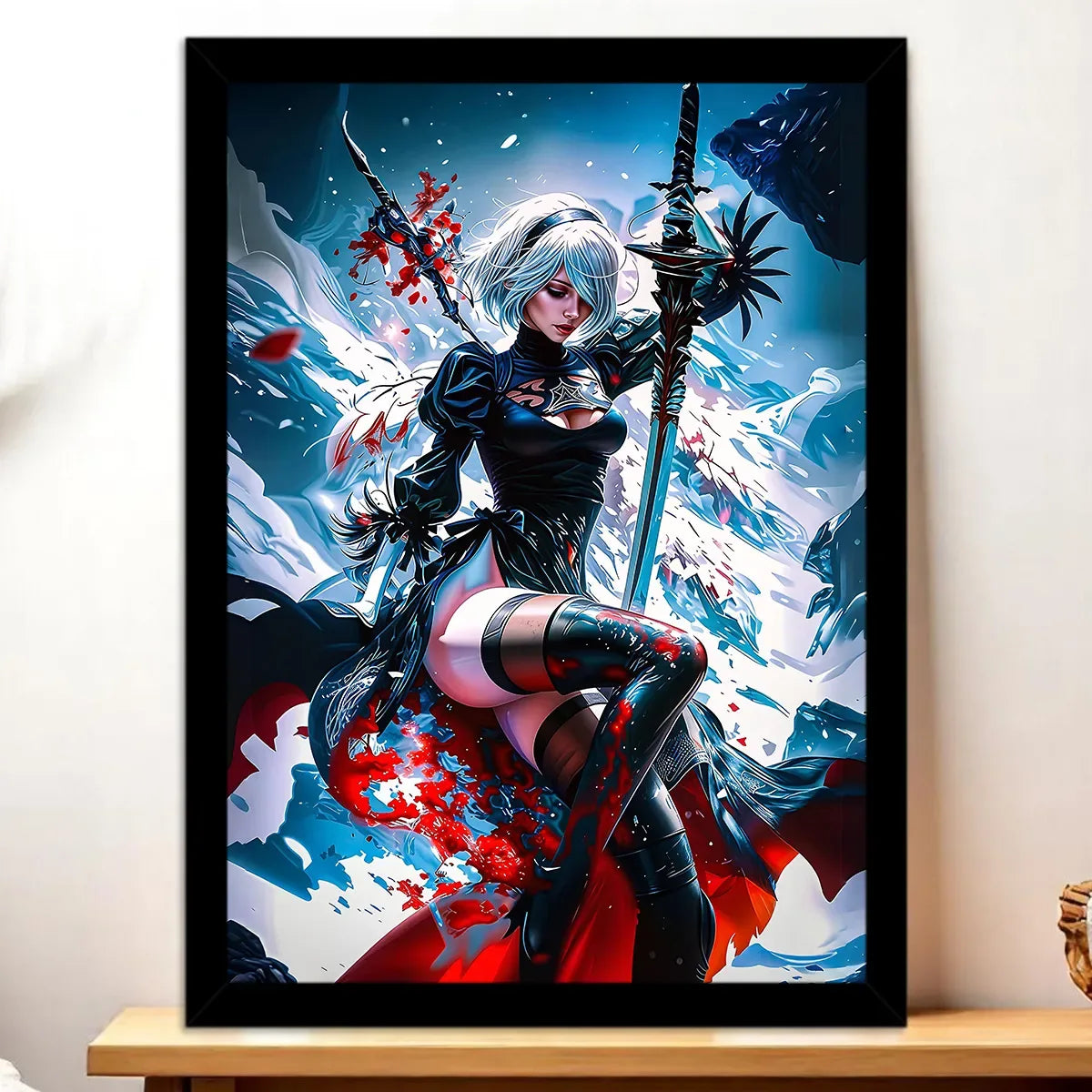 Parce que ce visuel ne se contente pas d’être joli, il raconte une histoire. Chaque détail de cette œuvre évoque la grâce combattante de 2B et l’émotion d’un monde déserté. Que vous choisissiez le tableau, l’affiche, le poster ou le cadre, le rendu premium transforme votre pièce en une scène à la fois douce et troublante. On est d’accord, c’est exactement le type d’illustration qui fait tourner les têtes et déclenche des conversations.