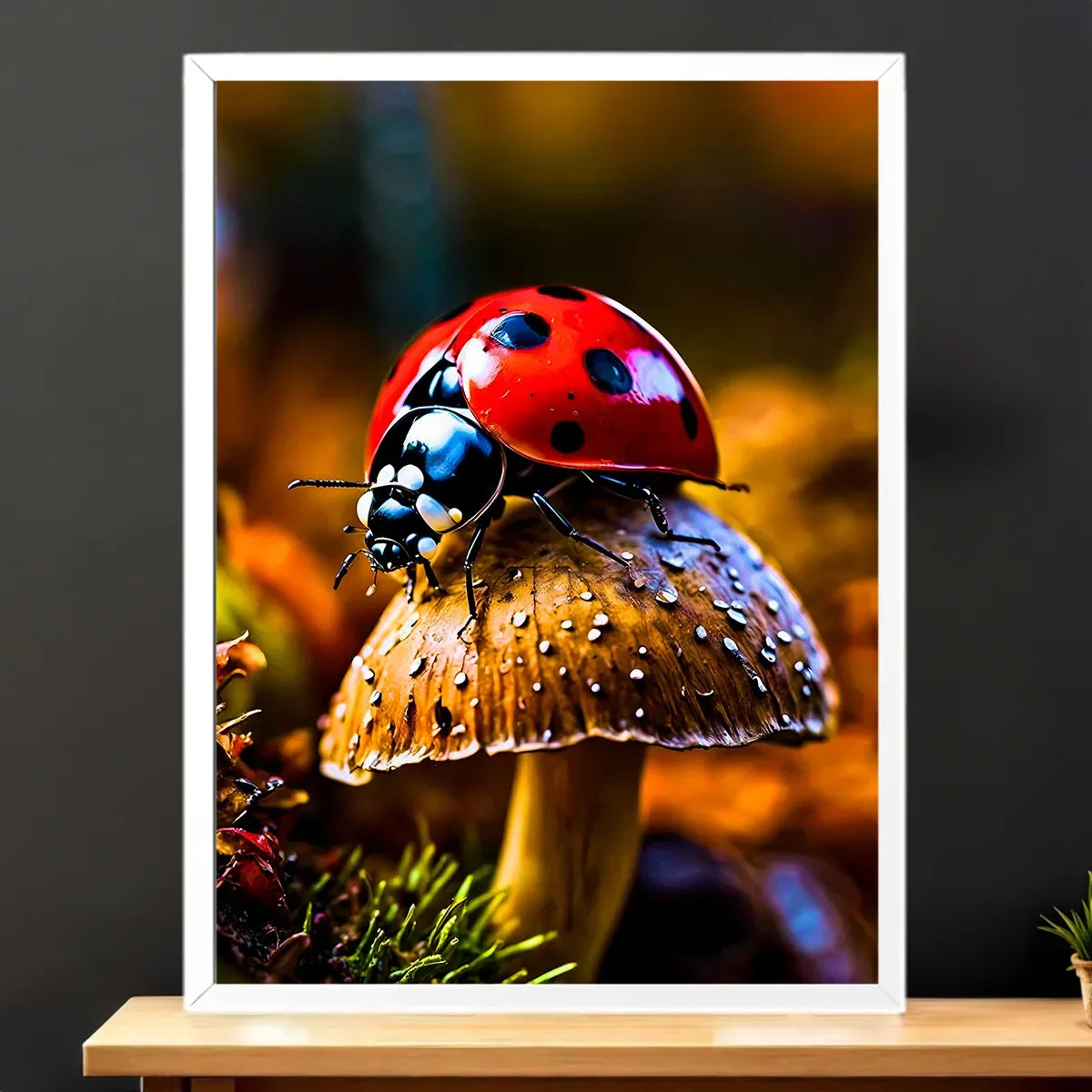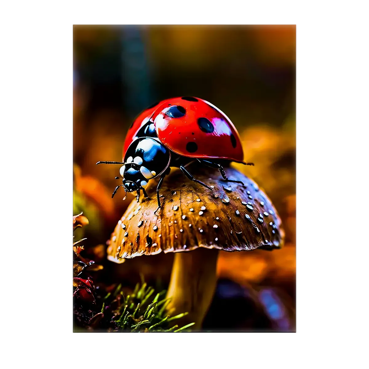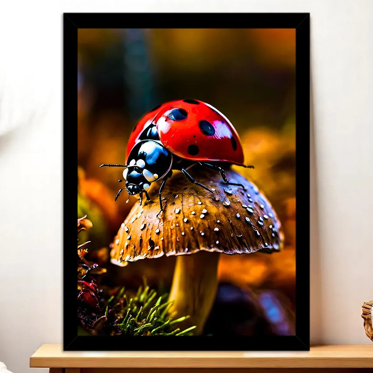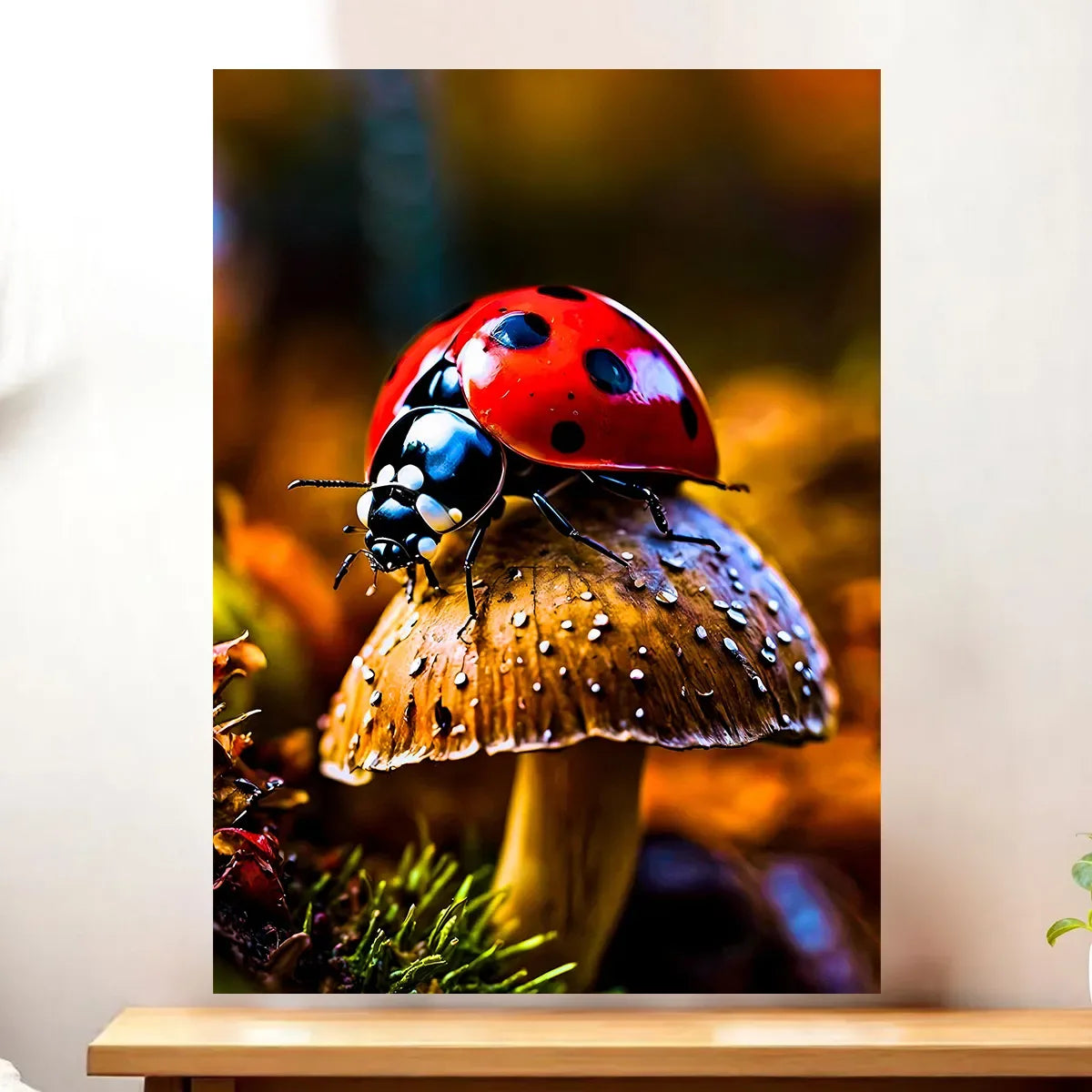 Le tableau est offert sur une toile tendue de qualité, châssis bois certifié FSC, en format 21×29 cm. Le textile imprime la lumière et les textures du visuel, chaque point noir et chaque reflet sur la carapace rendent la coccinelle presque palpable. C’est l’œuvre idéale quand on veut un rendu artistique et prêt à accrocher.