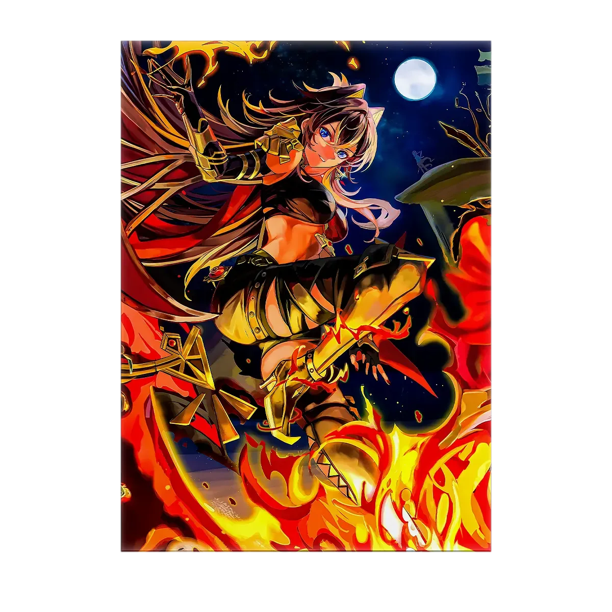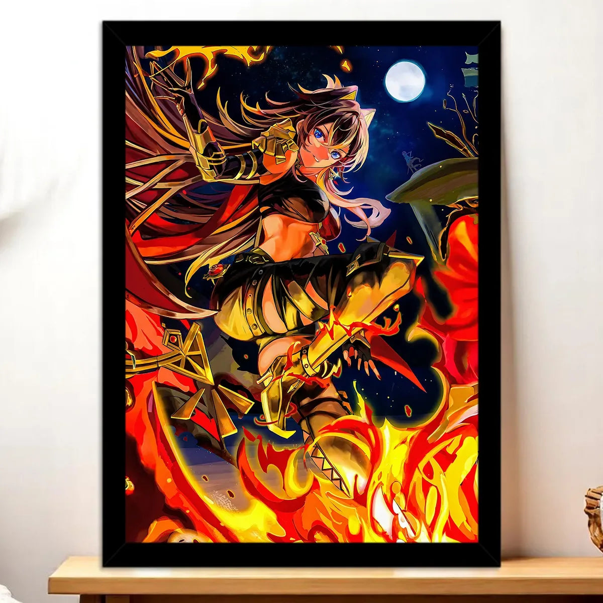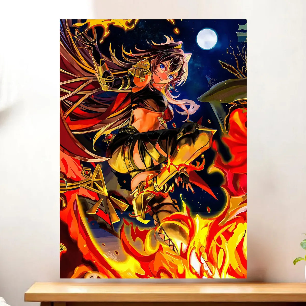 Le tableau est disponible en toile tendue sur châssis bois FSC, format 21×29 cm. Une toile qui donne du relief à l’illustration, une profondeur qui fait vibrer la crinière ardente et la posture guerrière de Dehya. Idéal pour un coin lecture, un bureau ou une chambre de fan.