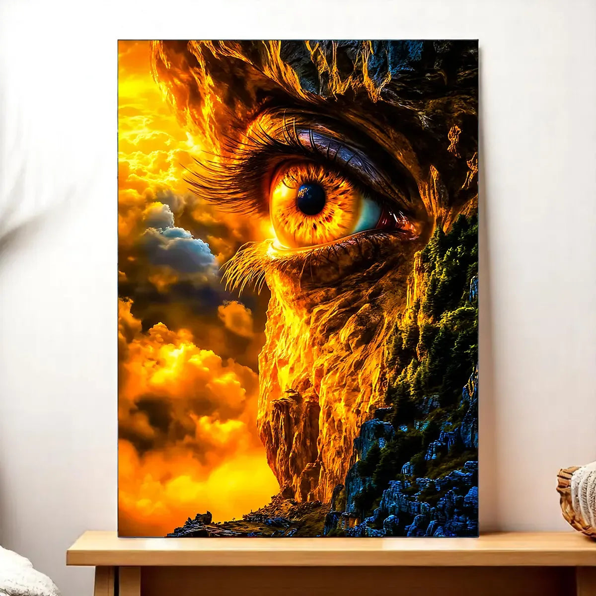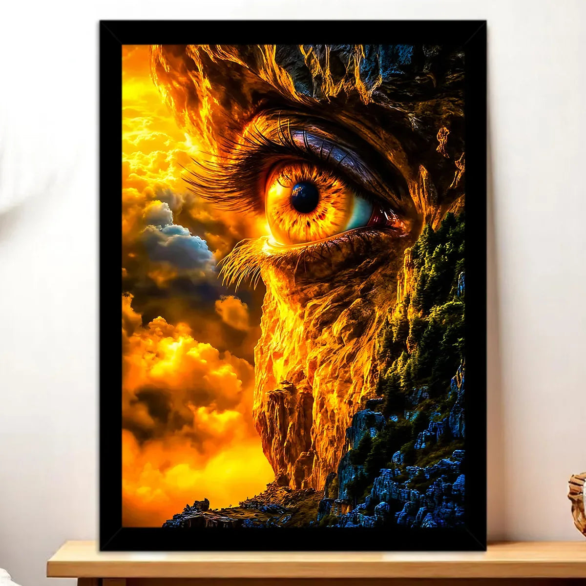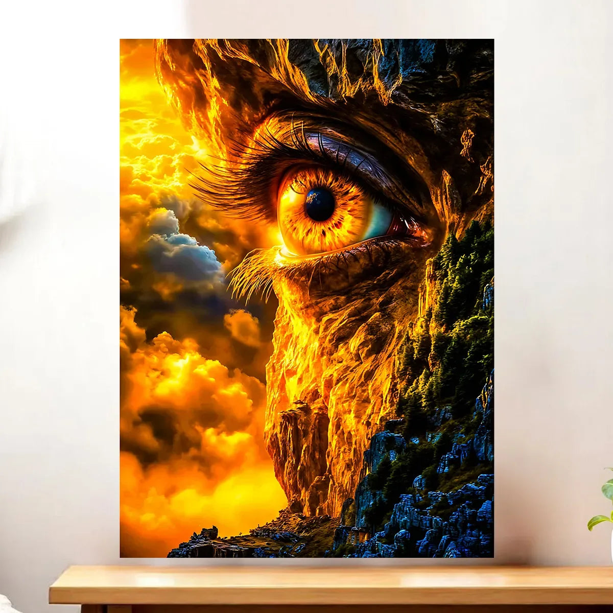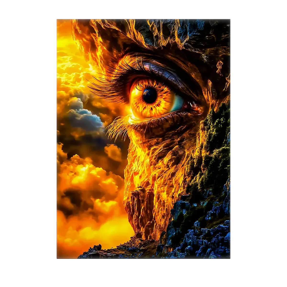 Le tableau est proposé en toile tendue sur châssis bois FSC format 21×29 cm. Une toile textile dense qui capte la lumière, révèle les textures de la roche et donne du relief au visage qui émerge. Ce format compact est parfait pour poser sur une étagère ou créer une petite galerie murale.