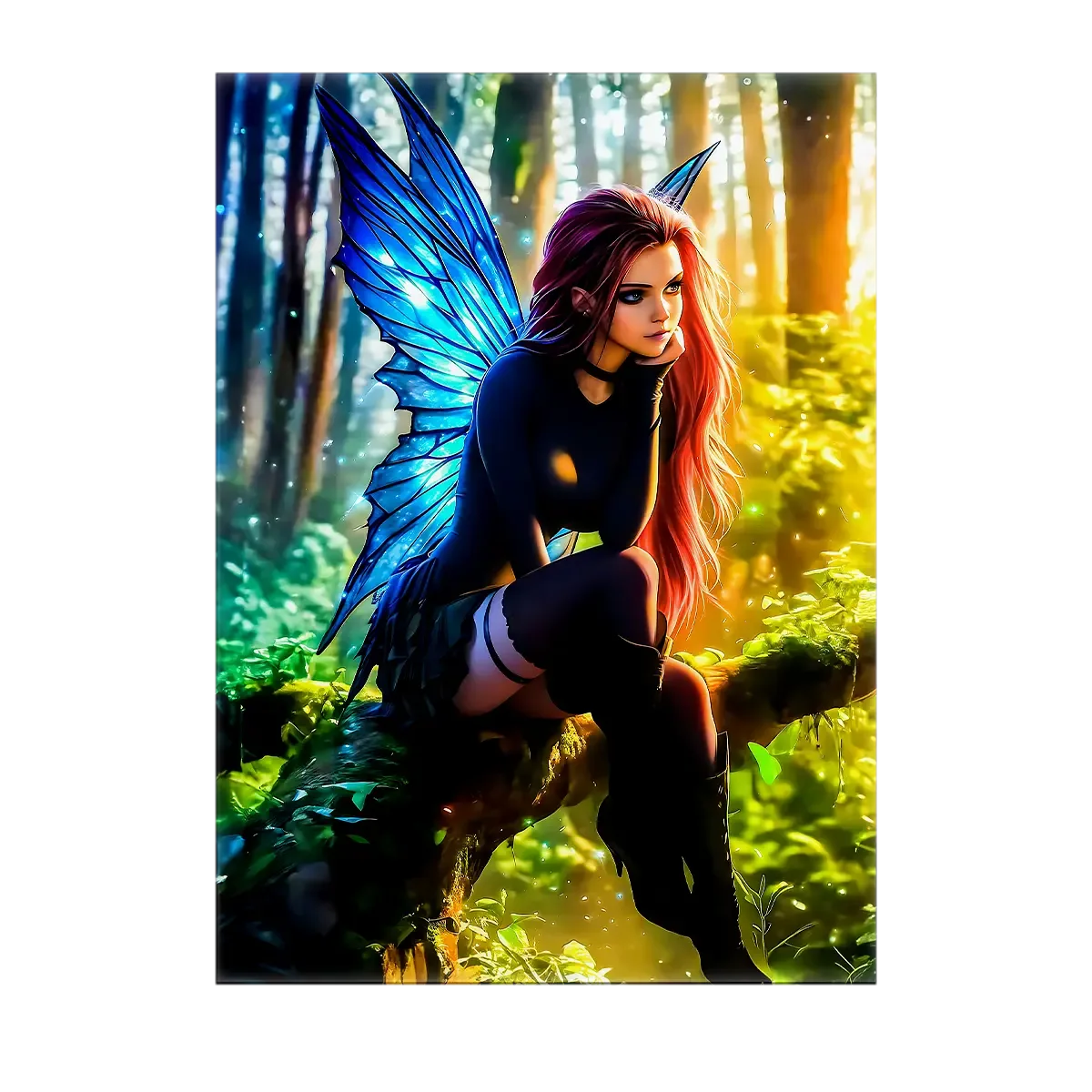 Le tableau est imprimé sur textile de haute qualité et tendu sur un châssis bois FSC, format 21×29 cm. La toile capte la lumière, les couleurs semblent palpiter et la texture donne une présence presque vivante à Fée Bloom. C’est la version idéale pour une déco soignée, posée ou accrochée, qui transforme votre espace en coin magique.