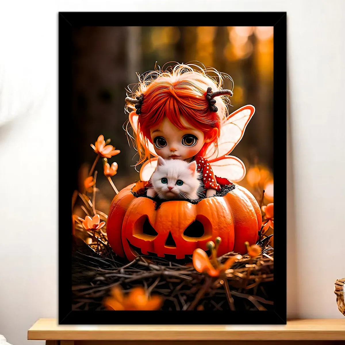 Le poster apporte un rendu cinématographique à l’illustration. Plus grand, plus immersif, il amplifie la scène et met en valeur les jeux de lumière autour de la citrouille et de la fée. Posez‑le sur un mur libre et regardez l’ambiance changer, doucement, presque comme une petite projection privée d’Halloween.