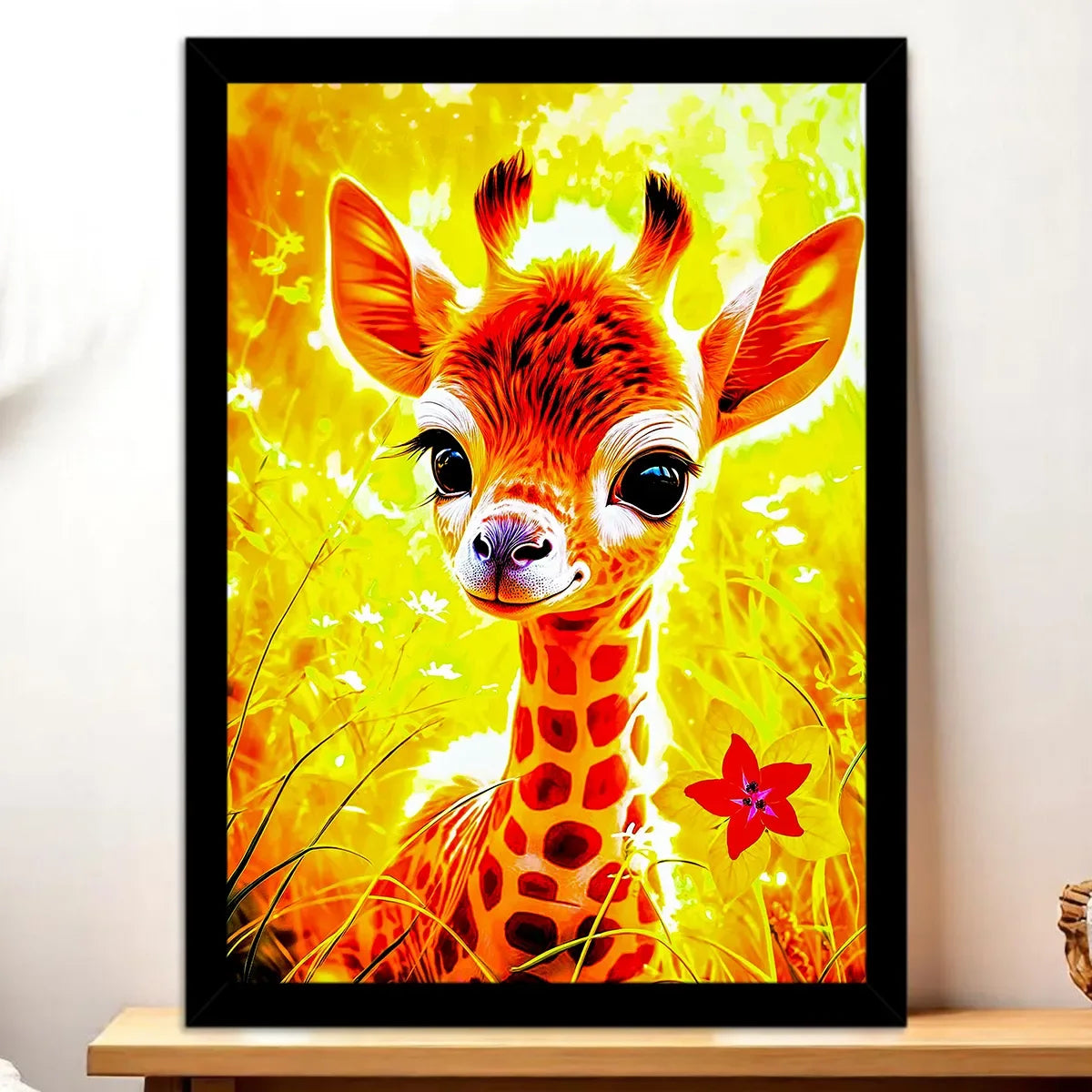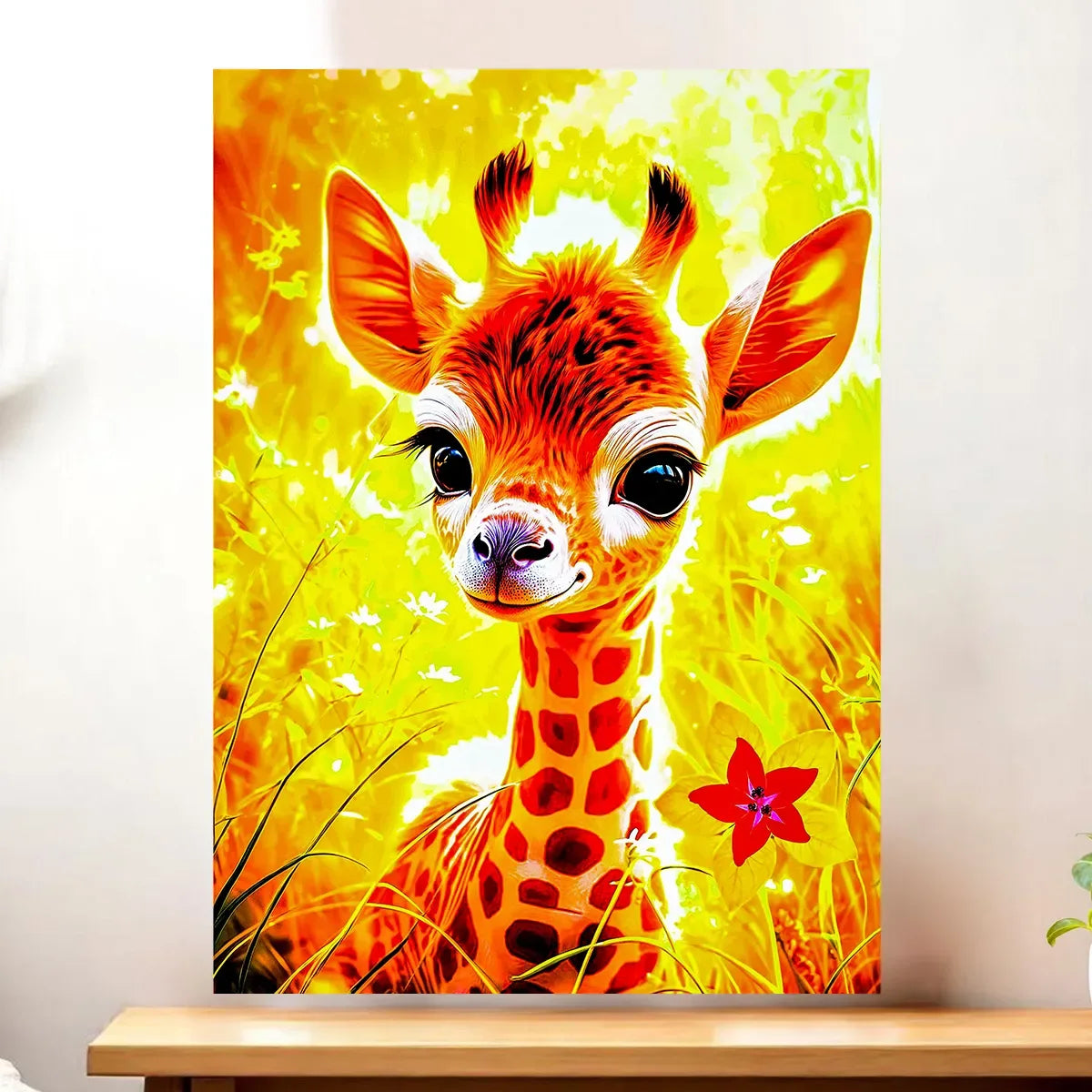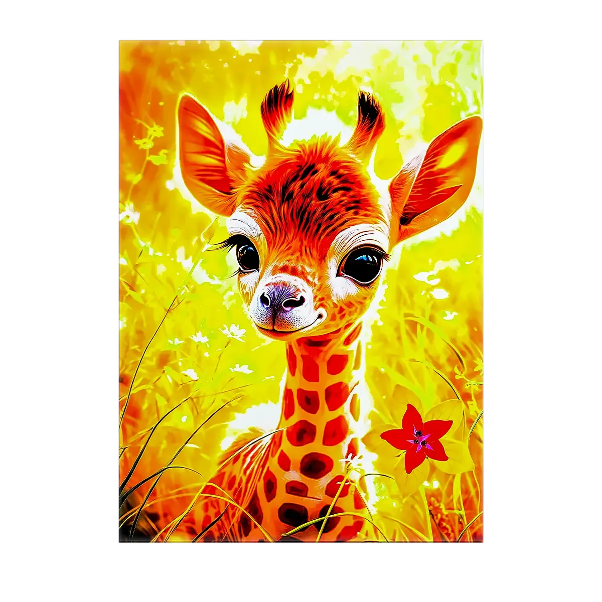 Le tableau est proposé en toile tendue sur châssis bois certifié FSC, format 21×29 cm. La texture du textile restitue la chaleur des couleurs et la finesse des détails, comme si la girafe respirait devant vous. Un rendu artistique parfait pour accrocher au salon, dans une chambre ou au coin lecture.