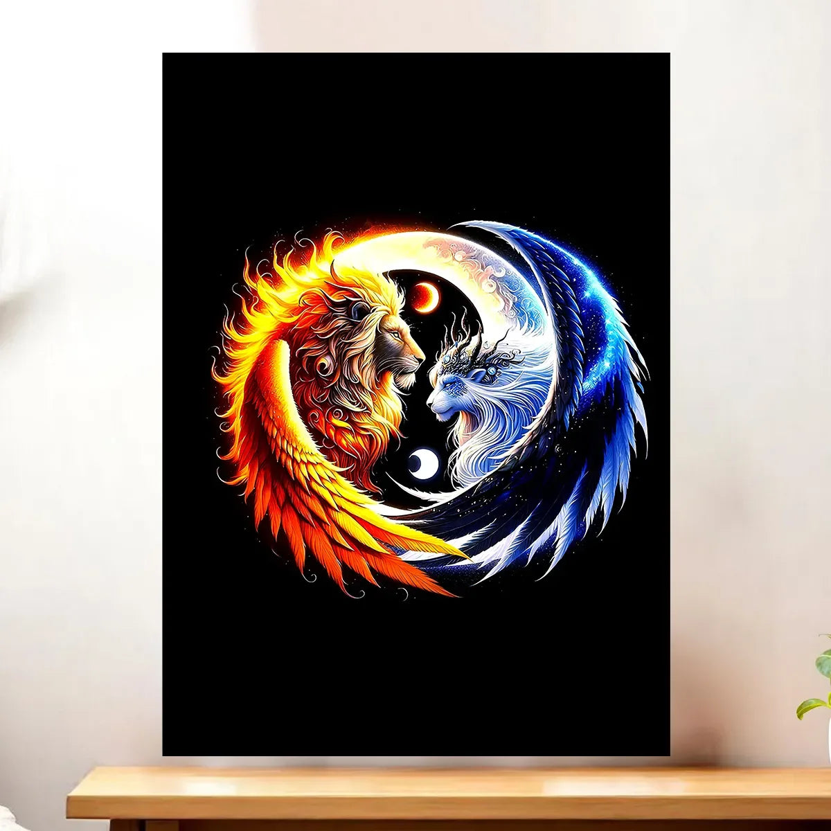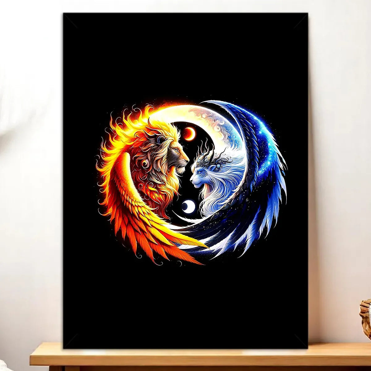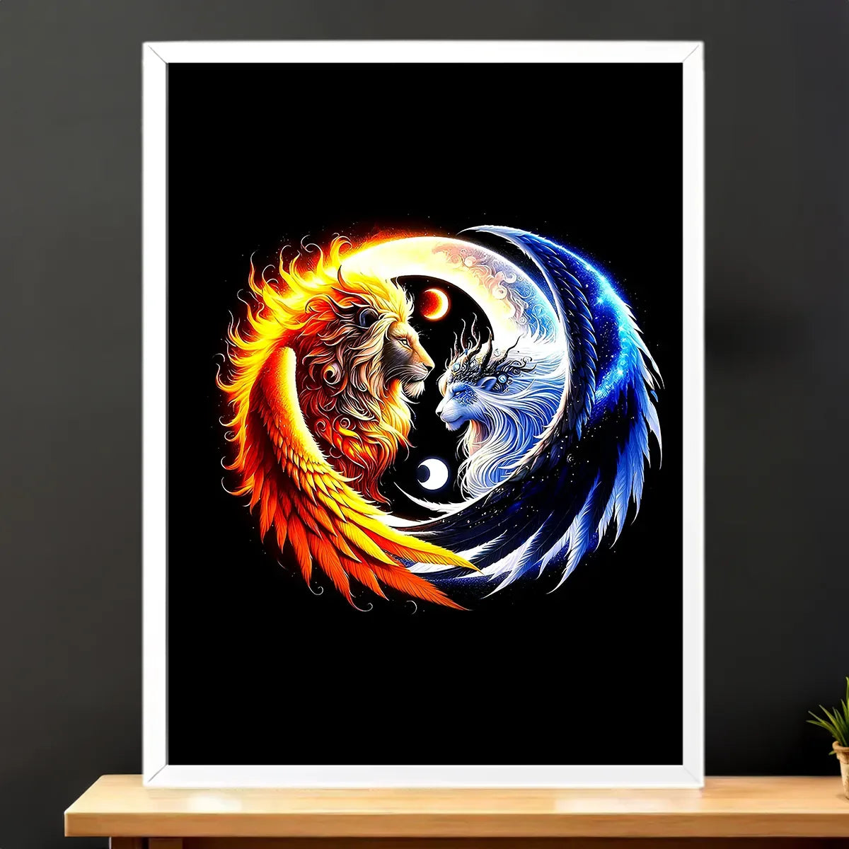 Le tableau est proposé en toile tendue FSC format 21×29 cm. La toile capte la lumière, donne de la profondeur au contraste et offre un grain artistique qui sublime le duo lion et lionne. Idéal pour poser sur une étagère, accrocher derrière un canapé ou enrichir un coin lecture.