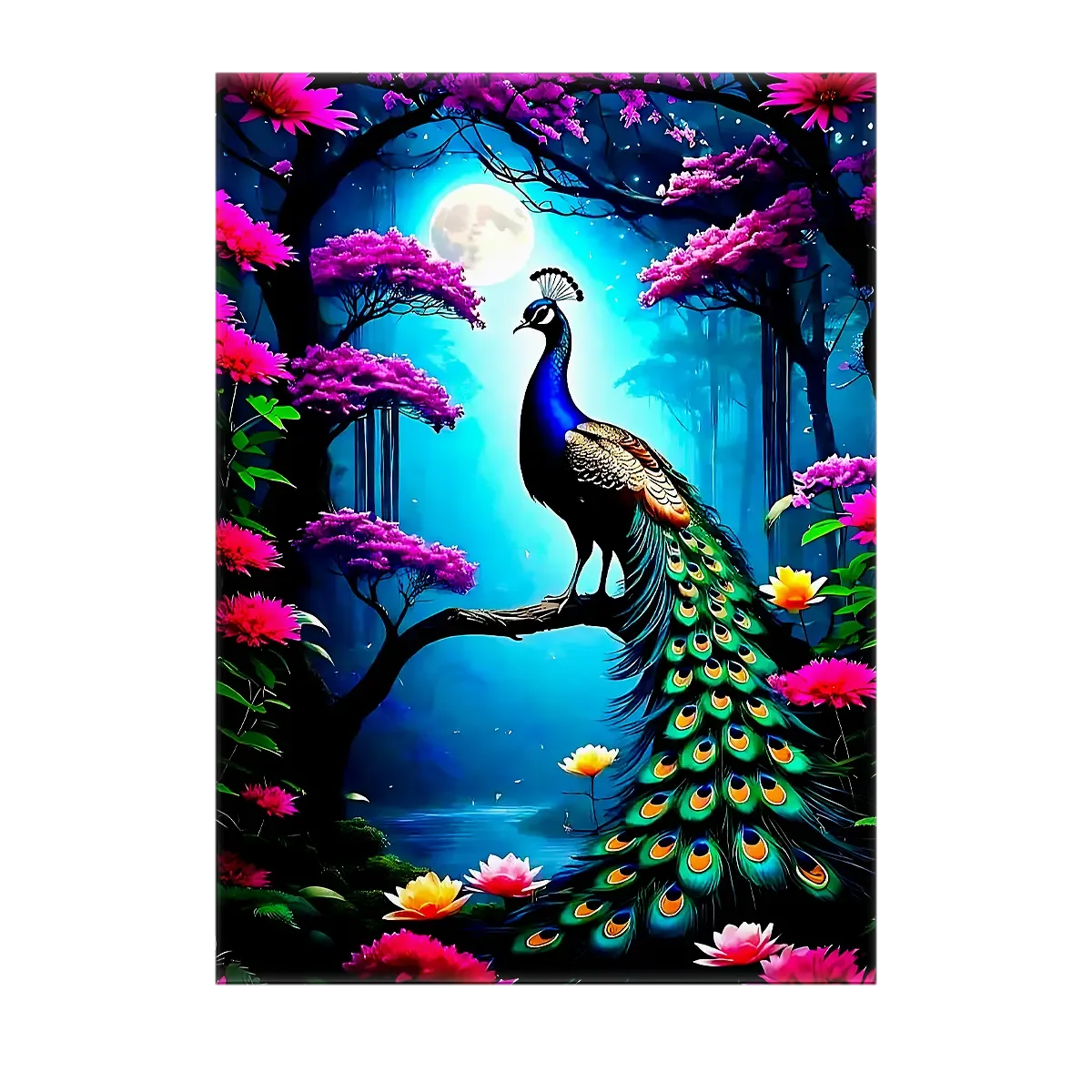 Le tableau est proposé en toile tendue sur châssis bois certifié FSC, format 21×29 cm. La toile offre une texture douce, un grain artistique qui restitue les nuances du paon comme une véritable œuvre. Idéal pour poser sur une étagère ou accrocher au-dessus d’un bureau pour une touche sophistiquée.