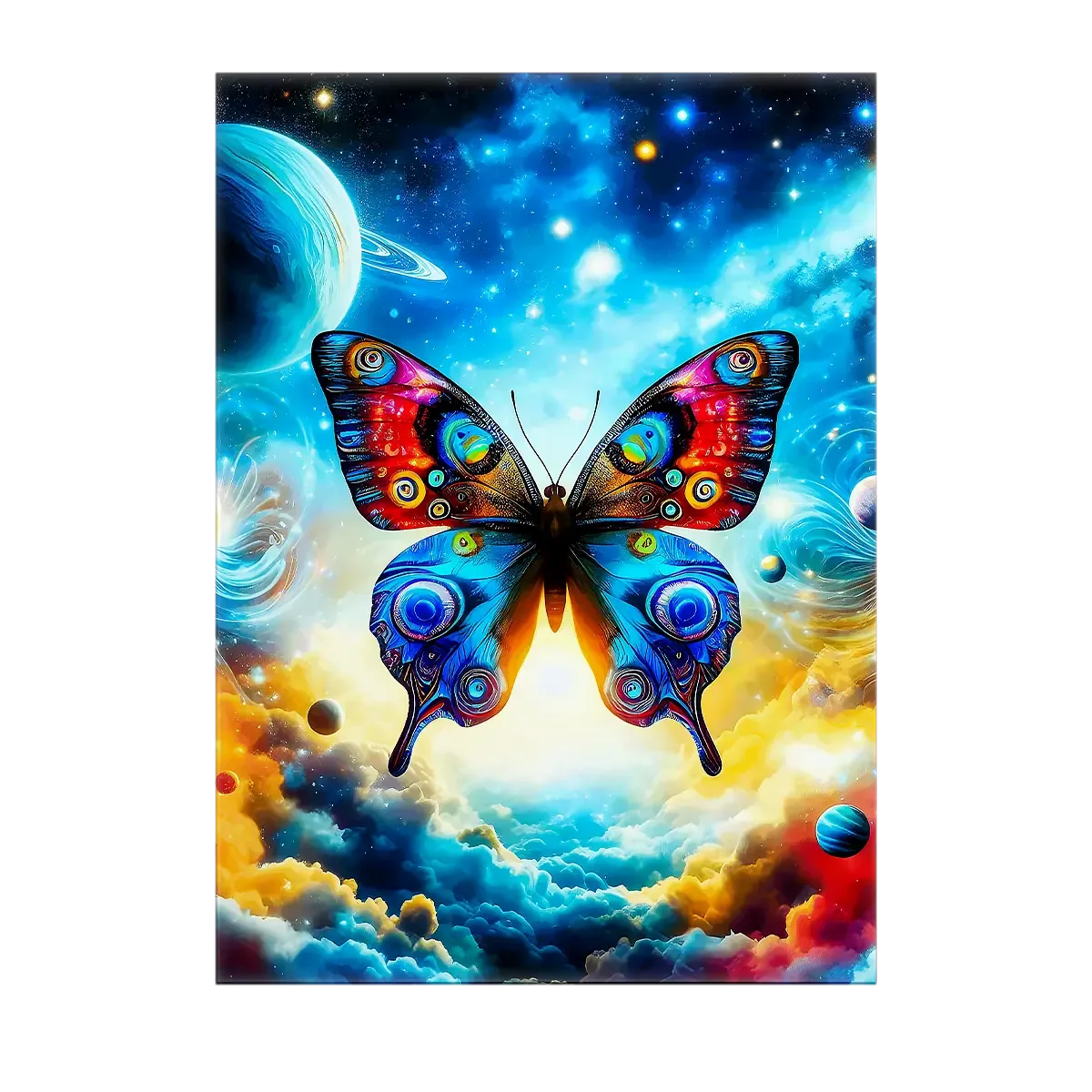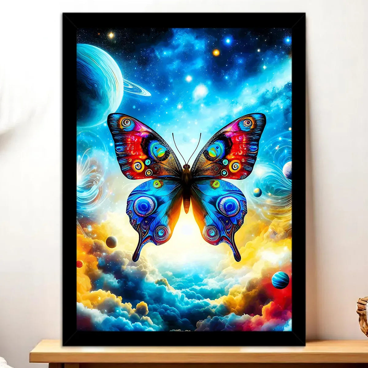 Le tableau est disponible en toile tendue sur châssis bois FSC, format exclusif 21×29 cm. La texture de la toile et la profondeur du châssis transforment l’illustration en véritable œuvre murale, avec des nuances de lumière qui jouent sur les ailes du papillon.