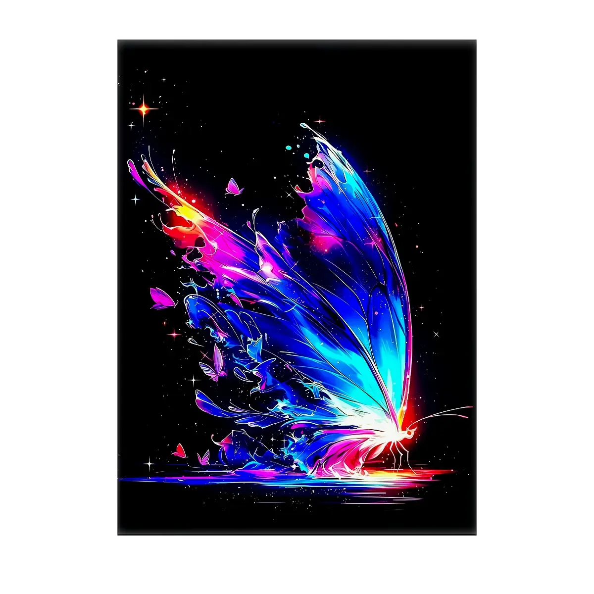 Le tableau est disponible sur toile tendue FSC, format 21×29 cm, pour un rendu texturé et profond. La toile sur châssis bois donne du volume aux papillons en relief, crée des jeux d’ombre et capture la lumière comme une petite sculpture murale. Idéal pour qui veut une œuvre prête à accrocher et qui respire l’artisanat.