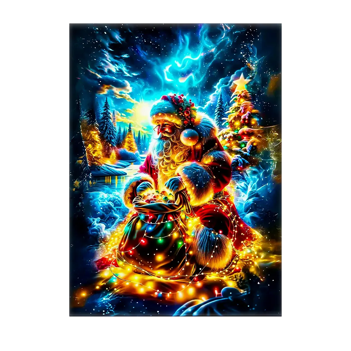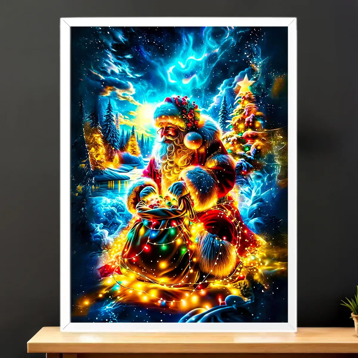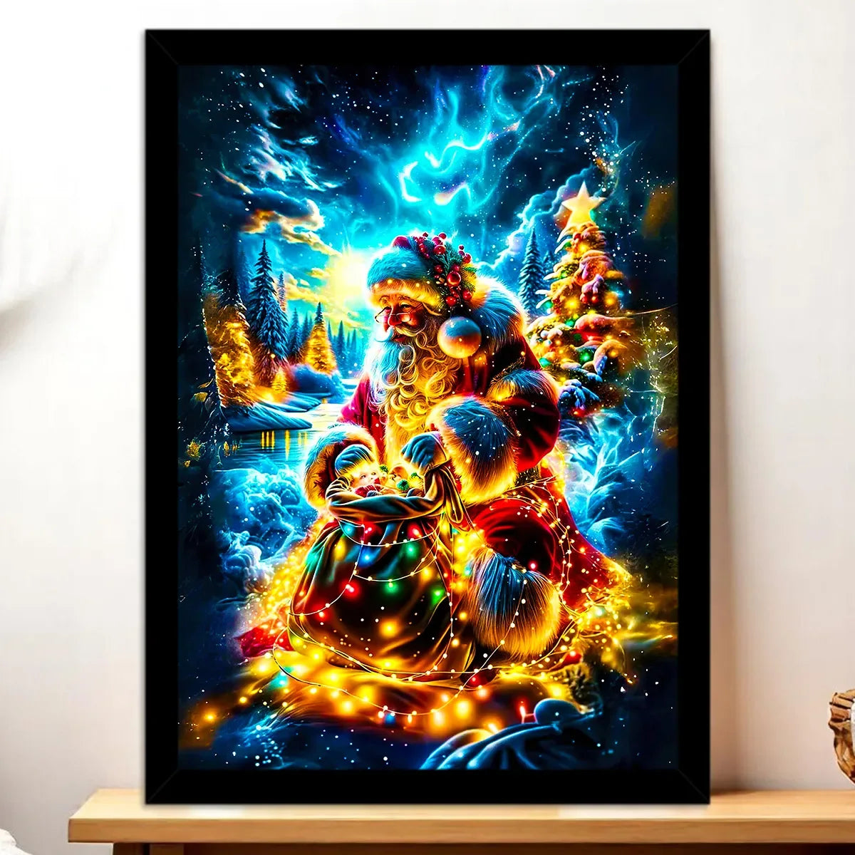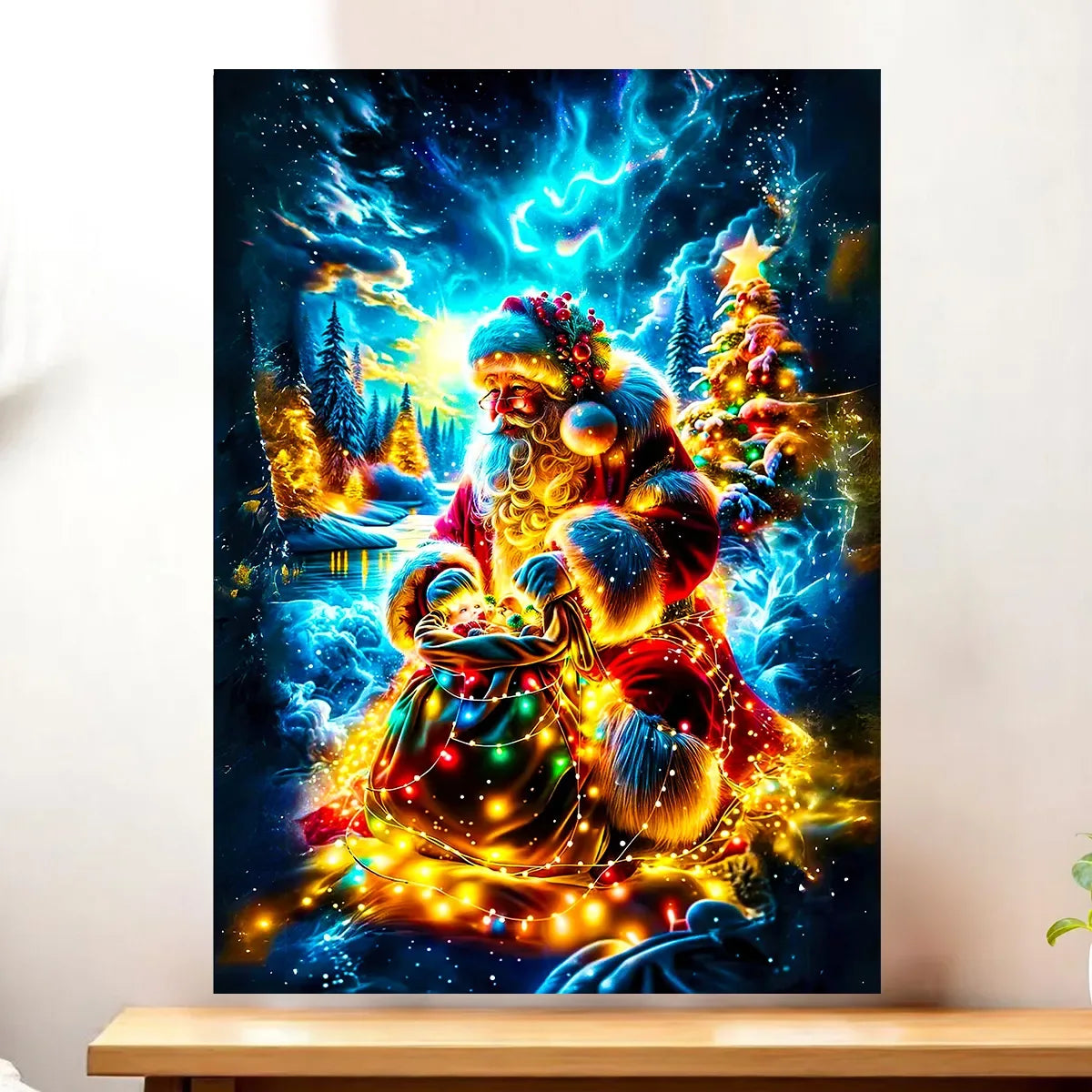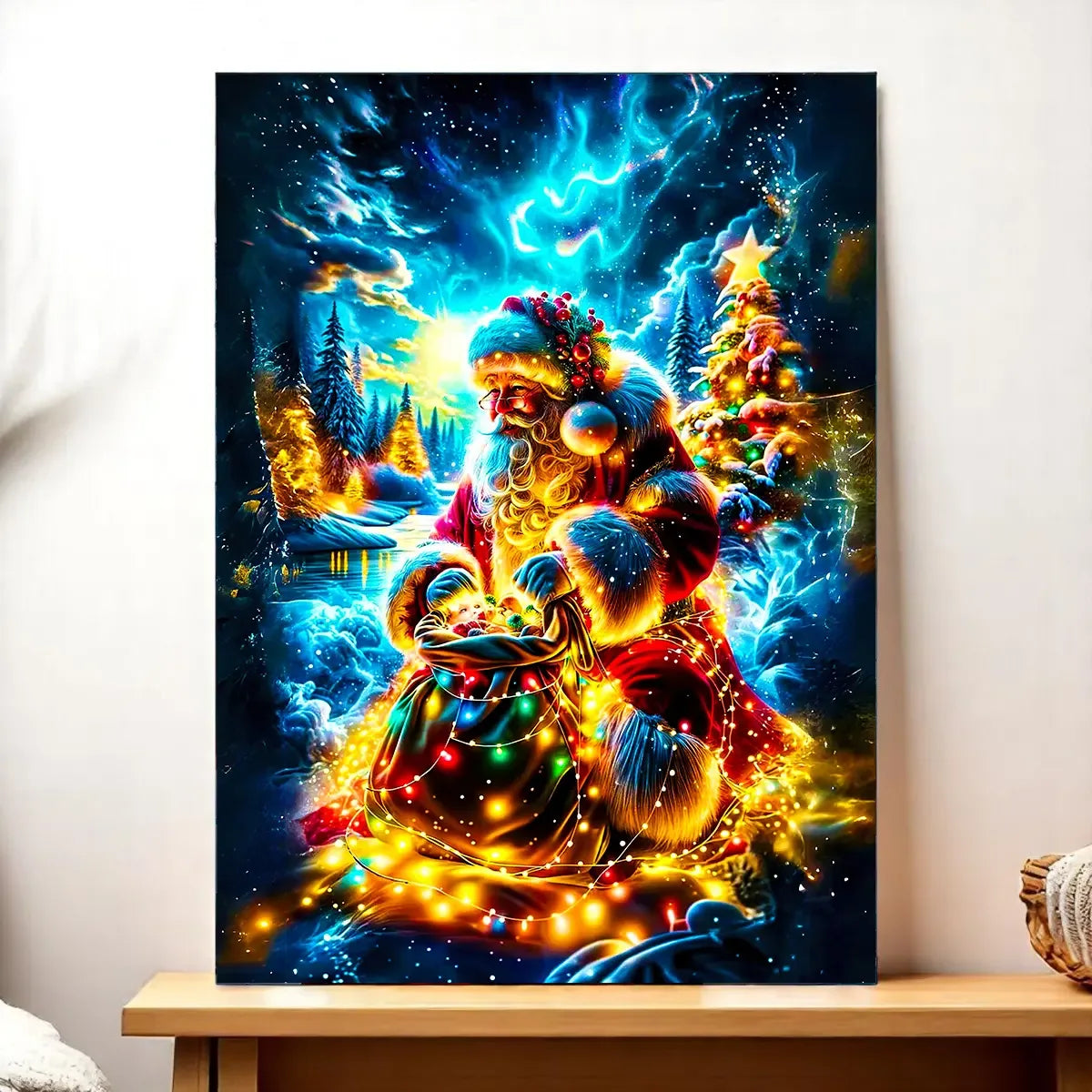 L’affiche Père Noël est imprimée en HD sur papier photo 200g, disponible en 10×15, 13×18, 21×29 et 30×40 cm. Version accessible et modulable, parfaite pour composer un mur de décorations ou pour glisser dans un cadre. L’illustration garde toute sa chaleur même en petit format, on sent presque les lumières du sapin.