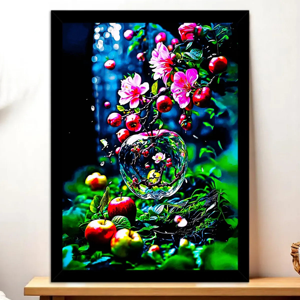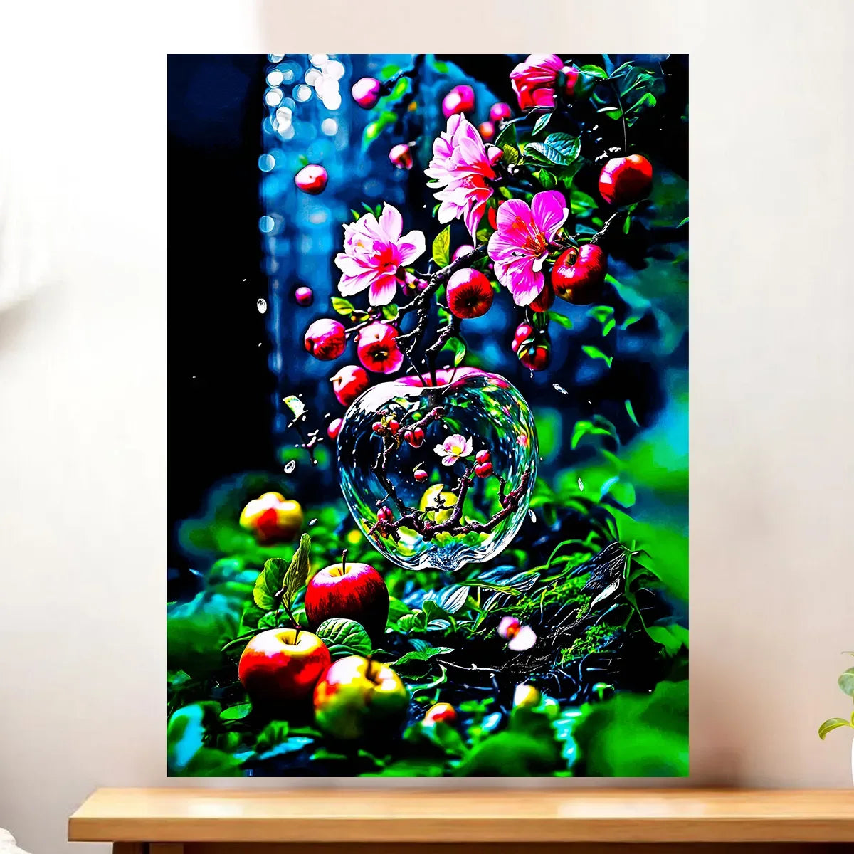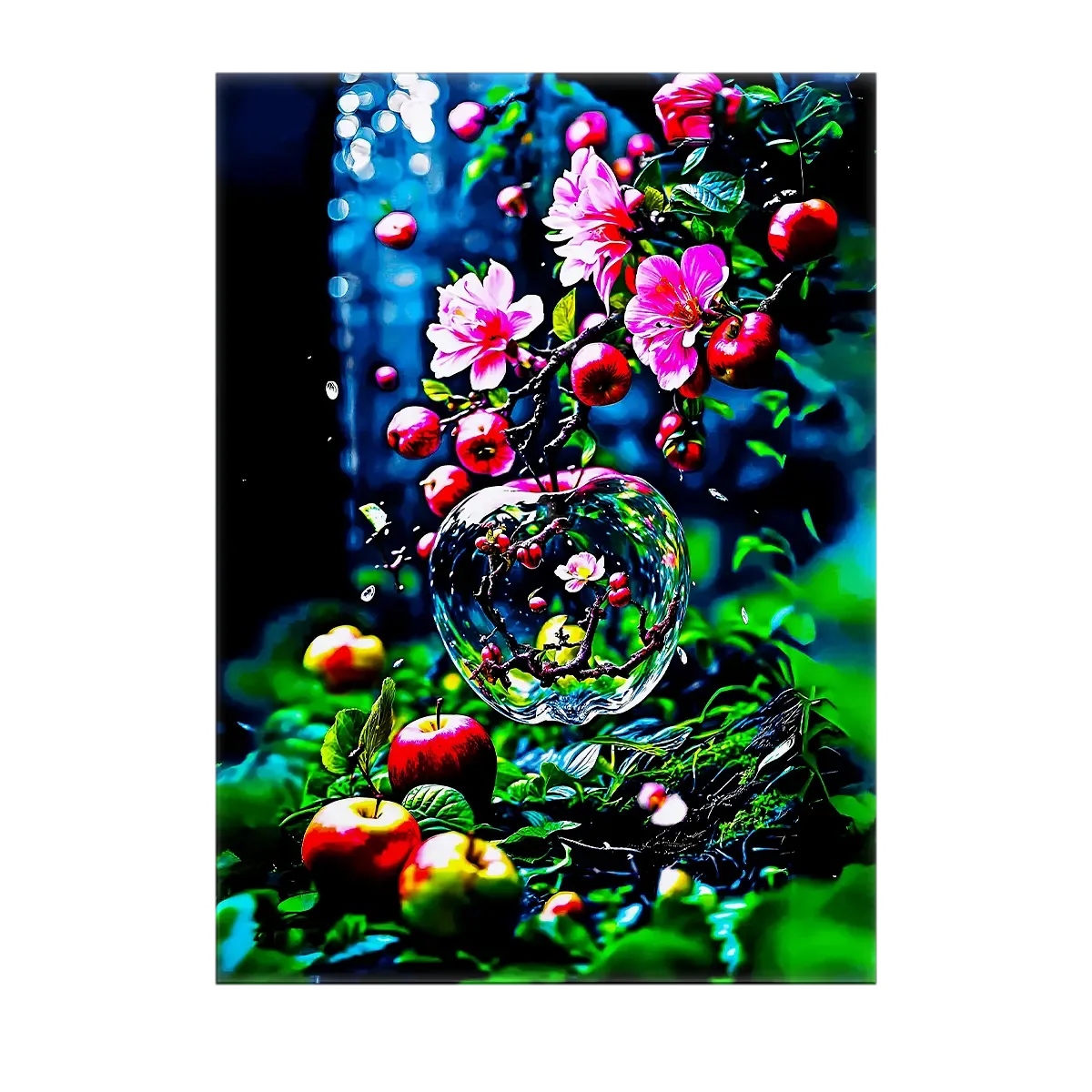 Le tableau est disponible en toile tendue sur châssis bois FSC au format exclusif 21×29 cm. Le rendu mat et la profondeur de la toile subliment les couleurs naturellement vives de la pomme et apportent une présence chaleureuse au mur.