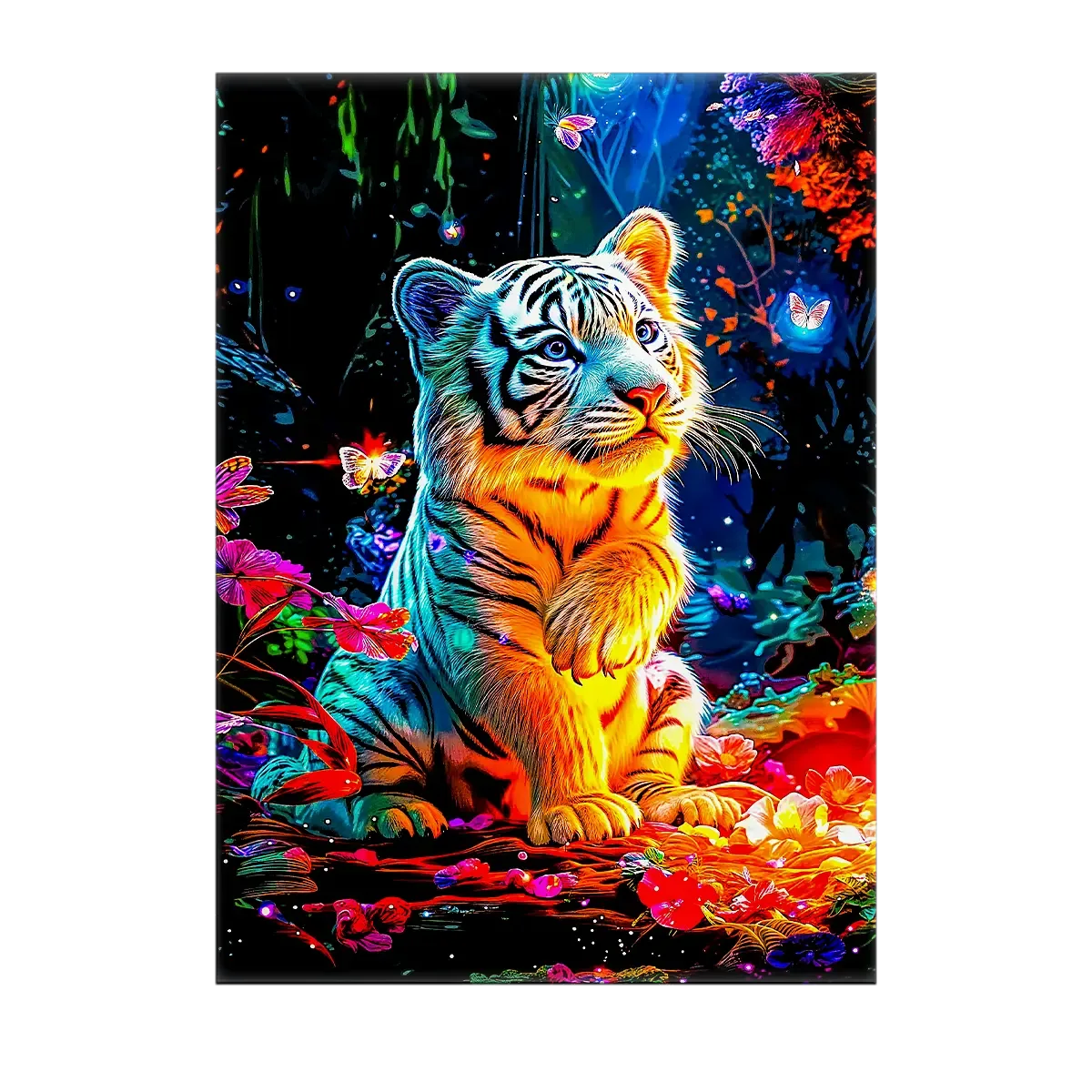 Le tableau est disponible en toile tendue FSC au format unique 21×29 cm. Le châssis bois et la toile offrent une profondeur et une texture qui renforcent le jeu d’ombres et de lumières. Idéal pour un salon, un bureau ou une chambre où le tigre peut imposer sa présence.